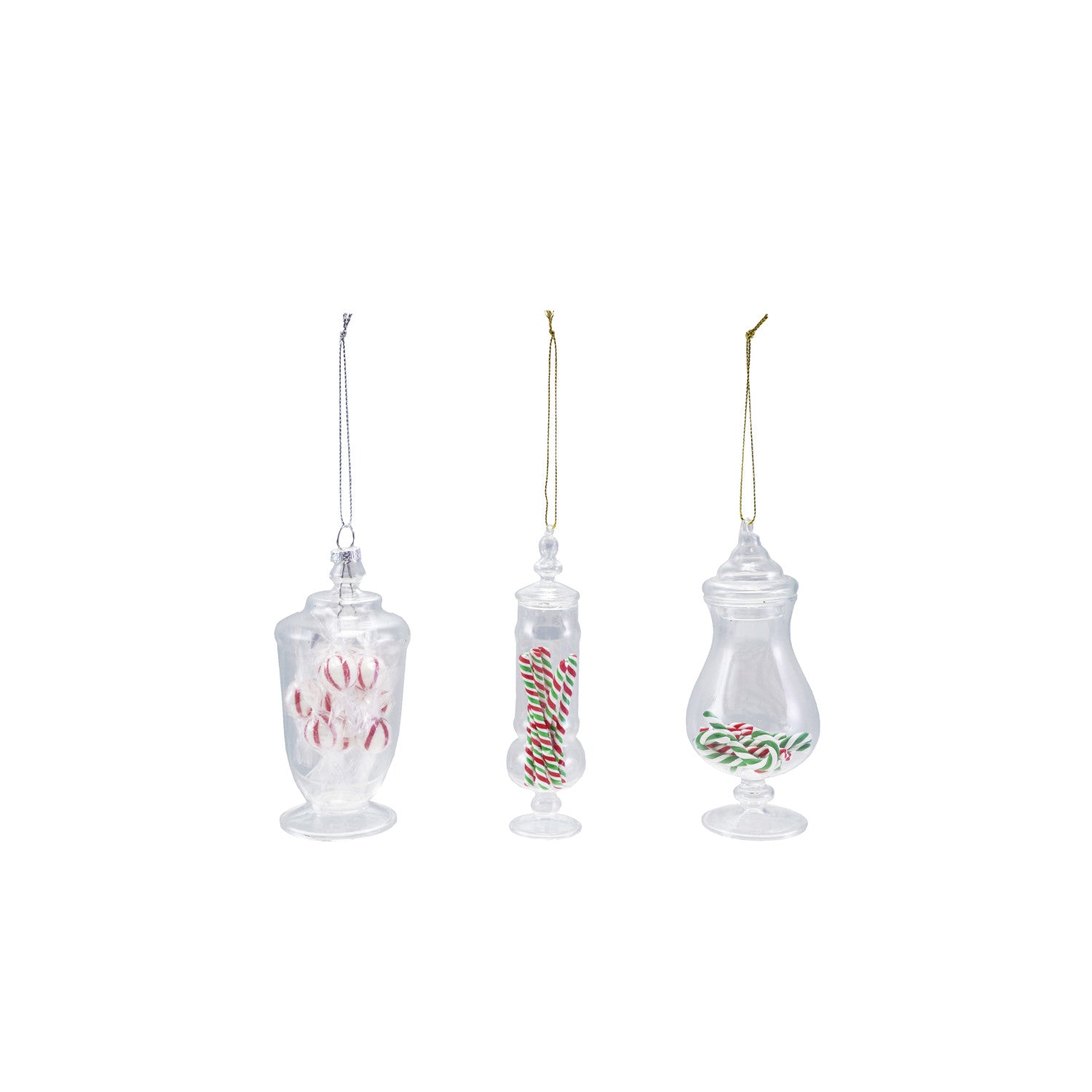 Add a playful pop of sweetness to your holiday decor with these glass candy jar ornaments, each filled with colorful faux candy for a nostalgic, festive look. With three charming styles to choose from, these ornaments are perfect for kitchens, candy-themed trees, or gifting to anyone with a sweet tooth. SOLD INDIVIDUALLY.