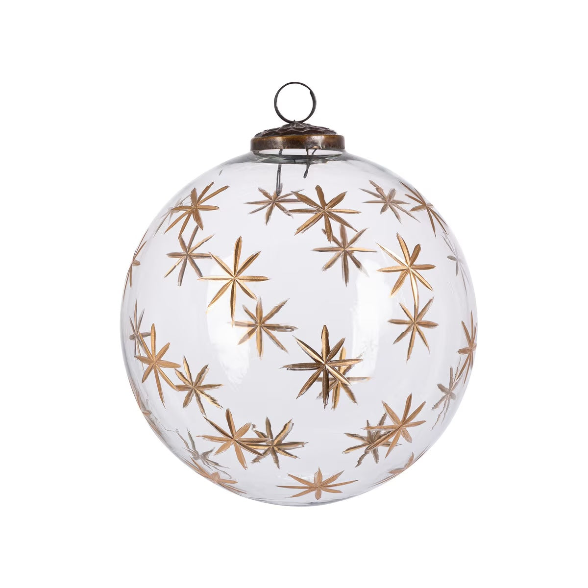 Add a touch of celestial beauty to your holiday decor with our Starry Night Ornament. Crafted from clear glass and etched with a delicate gold star design, this elegant ornament captures the magic of a starlit sky.