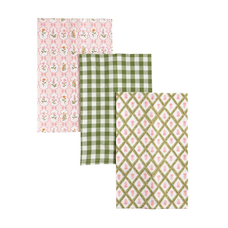 The Pink Greenhouse Kitchen Towel Set is a charming and functional addition to any kitchen. This set of three woven, yarn-dyed cotton towels features a fresh, garden-inspired design, including two towels with pink floral patterns and one green checked towel for a coordinated yet playful look.